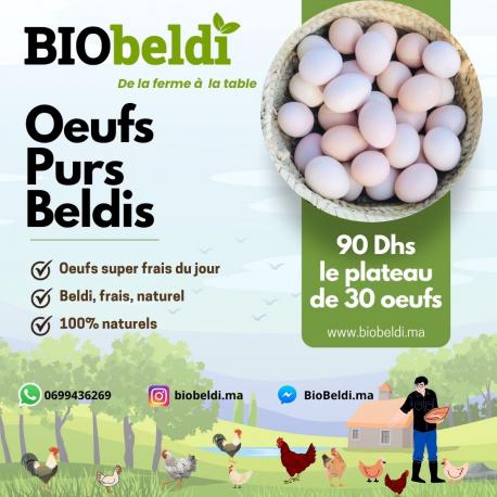 <p>Plateau d’œufs de poules beldi</p> <p>Oeuf poules beldi issus de notre elevage<br /><br /><strong>30 oeufs beldis à 90 Dhs</strong></p>